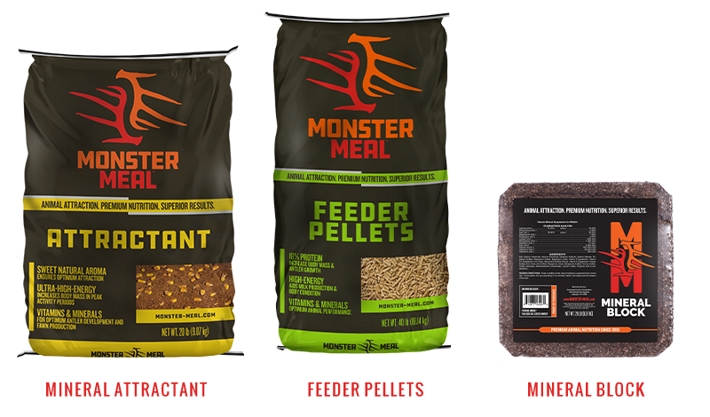 Limited natural browse combined with adverse weather conditions puts stress on deer. Pregnant does and rut weary bucks will benefit from MonsterMeal Feeder Pellets. MM Protein Blocks, MonsterMeal Feeder Pellets, and MM Mineral Blocks ensure biologically sound support for your winter deer herd. MonsterMeal Attractant is an excellent choice for “Post season inventory” in front of your trail camera.